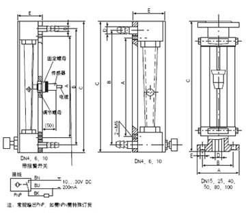 LZB/LZB-()F玻璃浮子流量計(jì)的錐管為光滑內(nèi)壁管(見(jiàn)圖4),通徑 D N 1 5 以上的流量計(jì),浮子通過(guò)導(dǎo)桿上下移動(dòng),保持穩(wěn)定; LZJ/LZJ-()F流量計(jì)錐管內(nèi)壁有三條導(dǎo)向凸筋,使浮子保持穩(wěn)定 (見(jiàn)圖5)。通徑DN10以下的流量計(jì)采用軟管連接,配有針形流量 調(diào)節(jié)閥;通徑DN15以上流量計(jì)采用法蘭連接。 |
