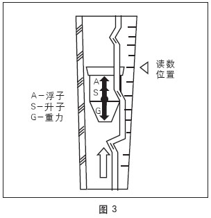 玻璃浮子流量計(jì)主要由一根自下而上擴(kuò)大的錐 形玻管和一只隨流體流量大小上下移動(dòng)的 浮子組成(圖3)。流體自下而上流經(jīng)錐 管時(shí),流體動(dòng)能在浮子上產(chǎn)生的升力S和 流體的浮力A使浮子上升,當(dāng)升力S與浮力 A之和等于浮子自身重力G時(shí),浮子處于平 衡,穩(wěn)定在某一高度位置上,錐管上的刻 度指示流體的流量值。 流量計(jì)中浮子讀數(shù)位置按圖2所示: |