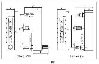 LZB-()WB系列流量計配有流量調(diào)節(jié)閥,外形及安裝尺寸見圖1和表1。 LZB-()W系列流量計不帶流量調(diào)節(jié)閥,外形及安裝尺寸見圖1和表1。 |